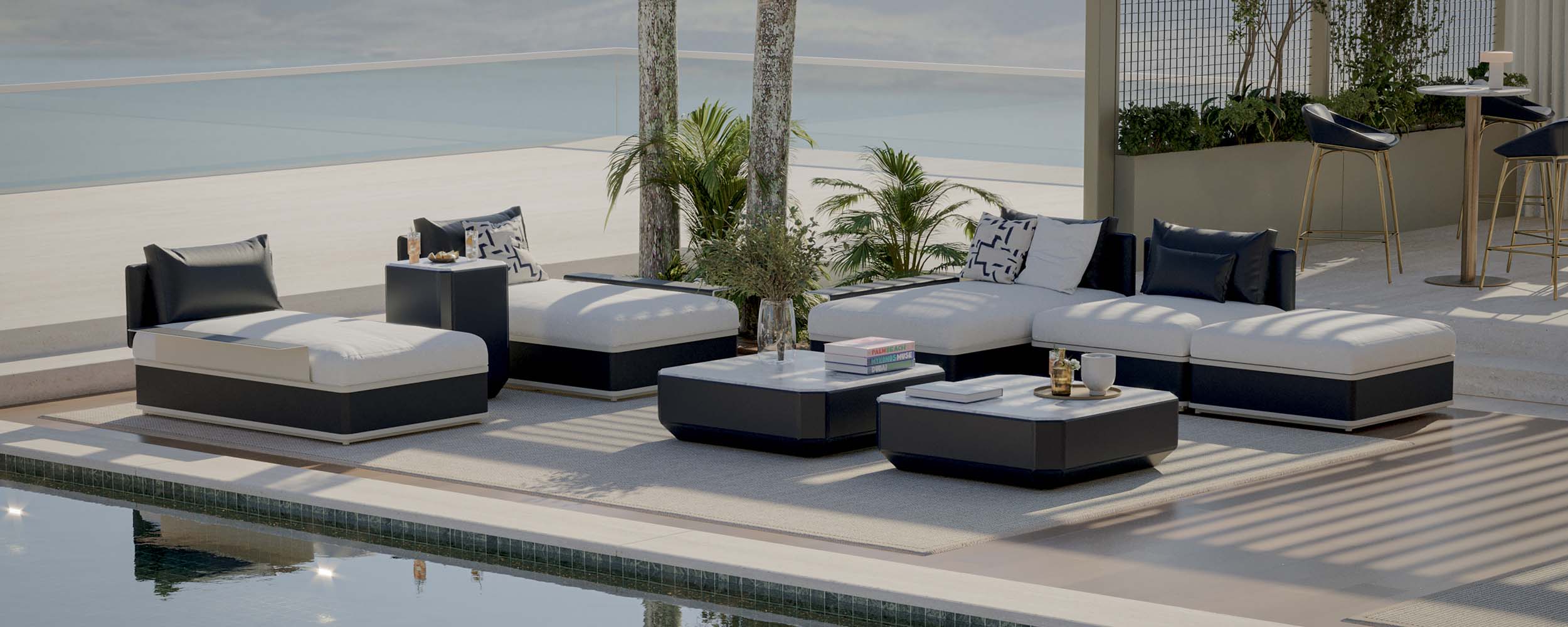 Découvrez le mobilier d'extérieur haut de gamme, combinant confort, durabilité, matériaux nobles et personnalisation. Marbre, Dekton, cuir outdoor et tissus résistants définissent notre offre, garantissant design et élégance.