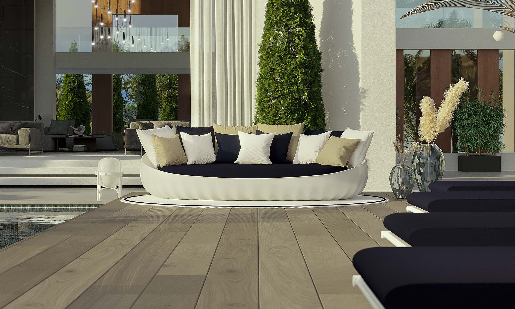 Nous utilisons des matériaux nobles et à la pointe de la technologie, comme le cuir outdoor, le marbre, le Dekton, l'acier inoxydable et des tissus haut de gamme résistants à l'eau, aux UV et à l'humidité.